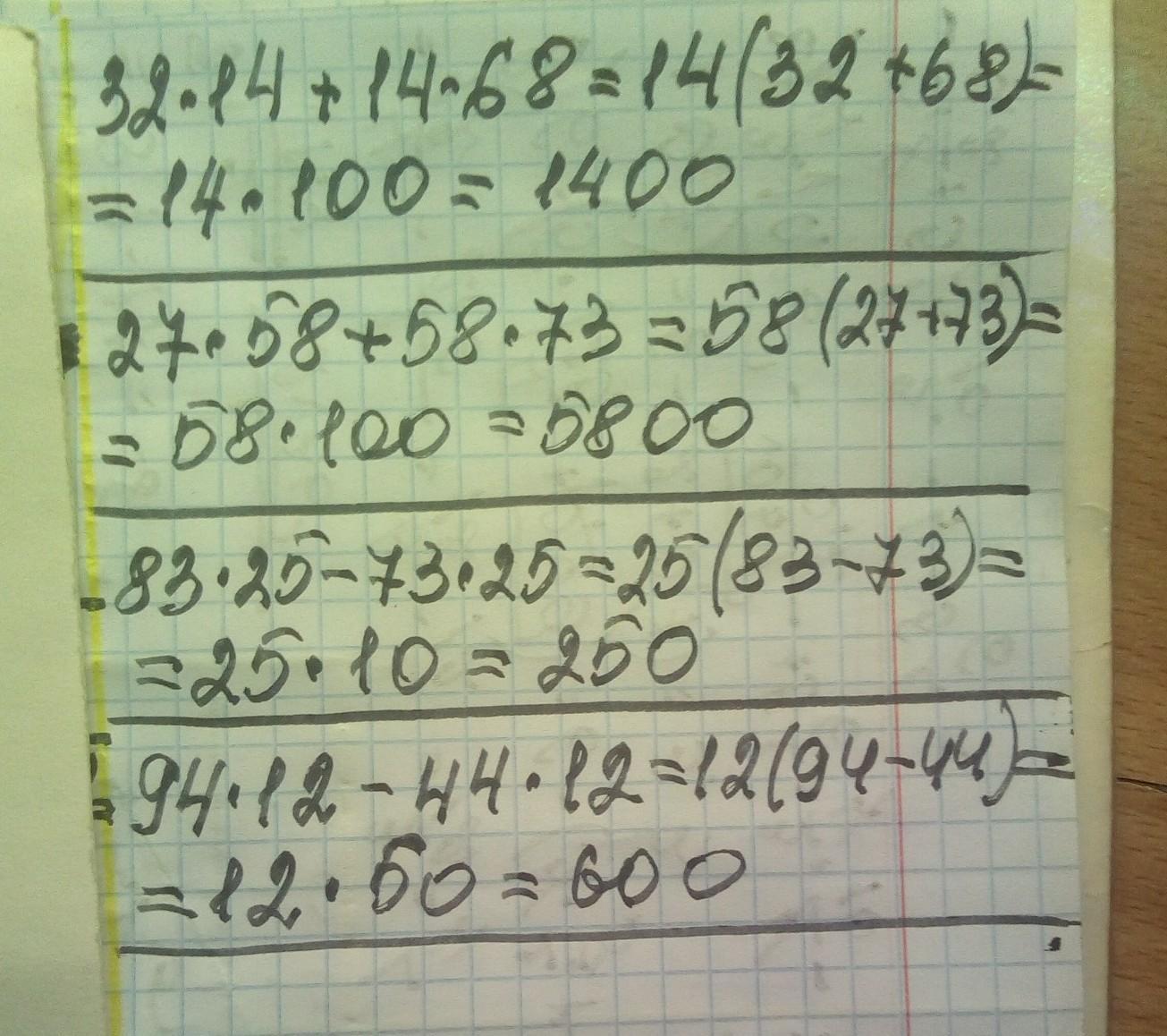 вычислите используя распределительное свойство умножения; 1) 32×14+14×68; 2) 27 • 58 + 58 • 73; 3) 83×25-73×25; 4) 94 • 12 – 44 • 12; ; помогите решить