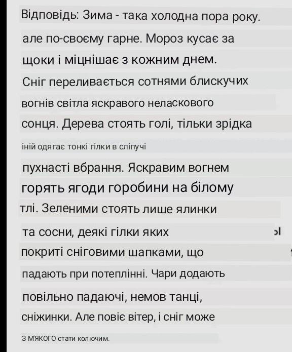 Зима( ім.) - така холодна(прикм.) пора( ім) року( ім) . але( прийм.) по - своєму( займ.) гарне(прикм.) . Мороз( ім) кусає( дієсл.) за( прийм.)щоки( ім) і міцнішає( дієсл.) з( прийм.) кожним(прикм.) днем( ім.) . Сніг( ім) переливається( дієсл.) сотнями(числ) блискучих(прикм.) вогнів( ім) світла( ім) яскравого(прикм.) неласкового(прикм.) сонця( ім) . Дерева( ім) стоять( дієсл.) голі(прикм.) , тільки зрідка(присл) нiй( займ.) одягає ( дієсл.)тонкі(прикм.) гілки( ім) в ( прийм.)сліпучі(прикм.) пухнасті(прикм.) вбрання( ім) . Яскравим(прикм.)вогнем( ім.) горять( дієсл.) ягоди( ім) горобини( ім) на( прийм.) білому(прикм.) тлі ( ім). Зеленими(прикм.) стоять( дієсл.) лише ялинки( ім) та( прийм.) сосни( ім) , деякі гілки( ім) яких покриті сніговими (прикм.)шапками( ім) , що ( прийм.)падають( дієсл.) при( прийм.) потеплінні (прикм.). Чари( ім) додають( дієсл.) повільно(присл) падаючі(присл) , немов танці( ім) , сніжинки( ім) .