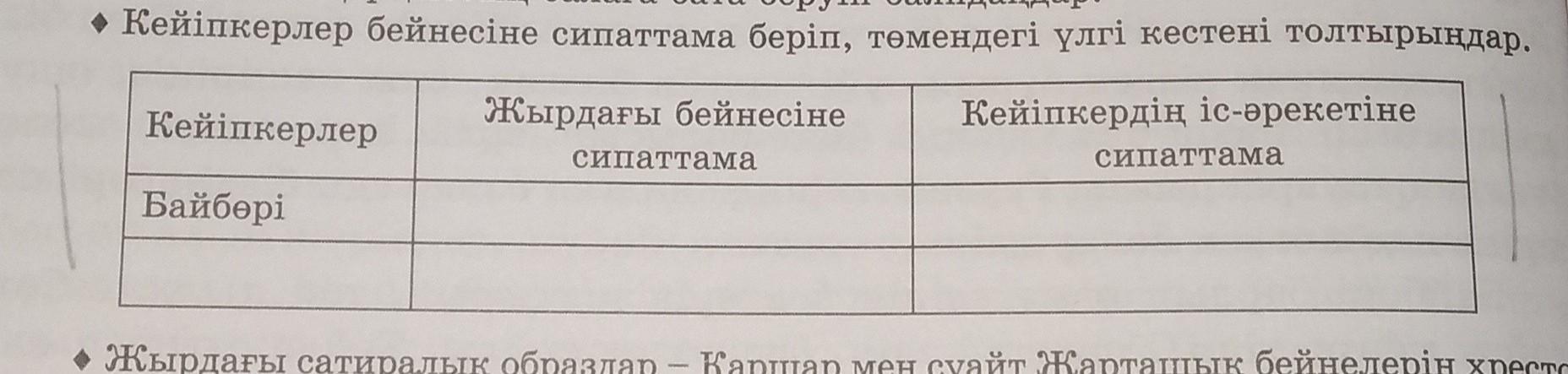 Кейіпкерлер бейнесіне сипаттама беріп, төмендегі үлгі кестені толтырыңдар! Байбөрге сипаттама жазып бкріңдерші?) Бәмсі Байрақты жаздым! Тек түсінбегенім Байбөрі
