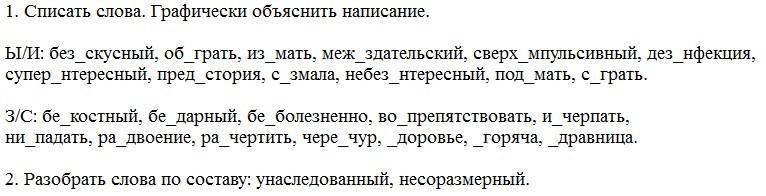 Бескостный,бездарный,бесполезно,воспрепятствовать,исчерпать,ниспадать,раздвоение,расчертить,чересчур,здоровье,сгоряча,здравница
