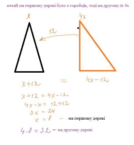на одному дереві сиділо в 4 рази більше горобців ніж на іншому коли із цього дерева зацвіли 12 горобців то на обох дерева горобців стало порівну Скільки горобців сиділо спочатку на кожному дереві?
