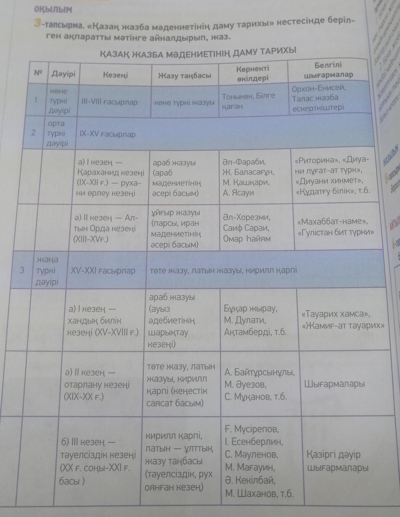 ОҚЫЛЫМ 3- -тапсырма. «Қазақ жазба мәдениетінің даму тарихы» кестесінде берiл- ген ақпаратты мәтінге айналдырып, жаз.