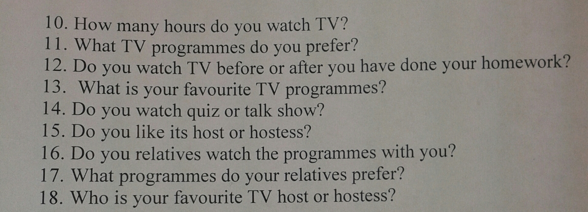 I usually watch TV two hours a day. I prefer watching programs about different journeys and travels. I tend to watch TV whilst eating usually. My favourite channel is Discovery because I find it interesting to watch. I also like watching quiz and talk shows if I have nothing to do and if I like its host. I often watch TV with my elder brother. My mum prefers watching talk shows and my brothers likes watching Discovery as well.