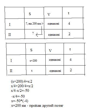 два потяги їхали з однаковою швидкістю перший потяг був у дорозі 4 год а другий 2 год причому перший проїхав на 200 км більше ніж другий скільки кілометрів проїхав другий потяг?