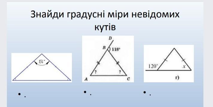 1) Сума кутів трикутника дорівнює 180°; Трикутник рівнобедрений, кути при основі рівні. (180-104)/2=76/2=38