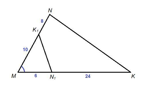 На сторонах МК и MN треугольника MKN отмечены соответственно точки И1 и К1. Известно, что MN1= 6 см, N1K = 24 см, MK1 = 10 см, K1N = 8см. Докажите, что треугольники МNK и MN1K1 Подобны.
