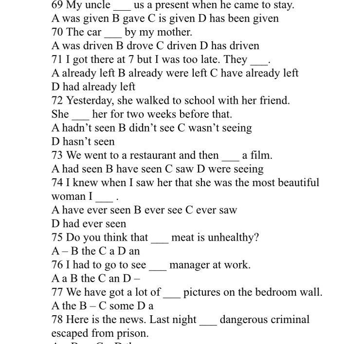 71 D (они уже ушли, действие произошло раньше прихода говорящего, поэтому Past Perfect)