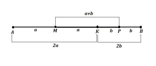 АВ=АК+ВК=2а+2b=2(a+b) ⇒ MP=a+b=2(a+b):2=АВ/2