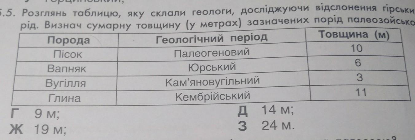 5.5. Розглянь таблицю, яку склали геологи, досліджуючи відслонення гірських по- рід. Визнач сумарну товщину (у метрах) зазначених порід палеозойської ери. Геологічний період Товщина (м) Порода Пісок Вапняк Вугілля Глина г 9 м; ж 19 м; ПалеогеновИЙ Юрський Кам'яновугільний КембPIЙСЬКИЙ д 14 м; 3 24 м. 10 6 3 11 подою?