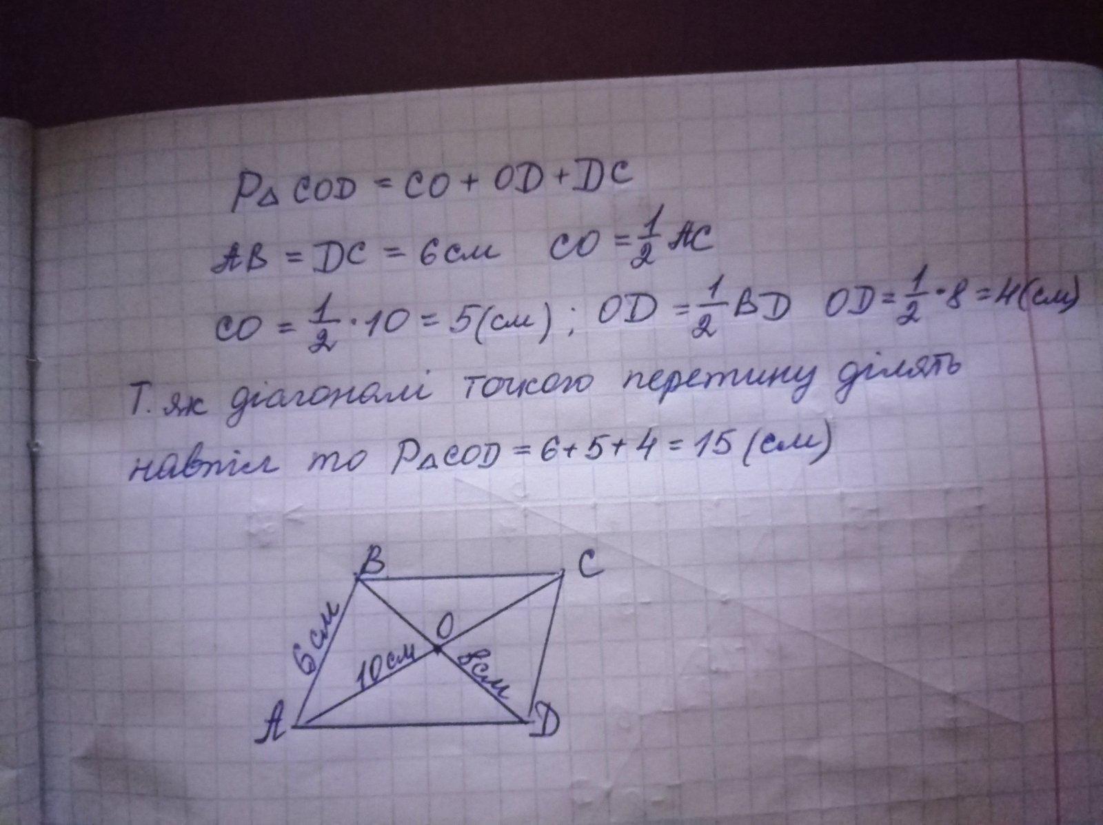 У паралелограмі ABCD відомо , що АВ = 6 см , АС = 10 см , BD - 8 см , 0 - точка перетну його діагоналей . Знайдіть периметр трикутника COD .