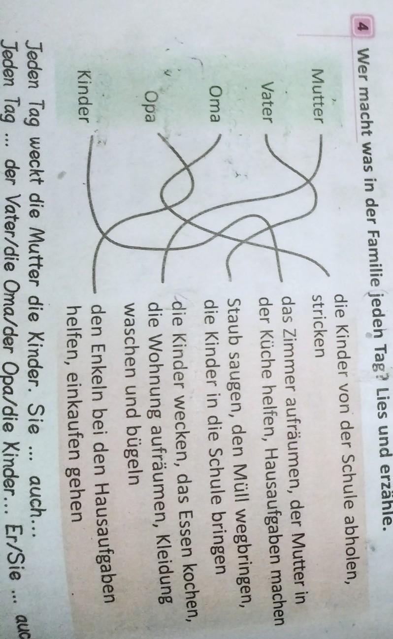 Jeden Tag weckt die Mutter die Kinder. Sie wascht und bügelt auch Kleidung, kocht das Essen und räumt die Wohnung auf. Jeden Tag hilft der Opa deb Enkeln bei den Hausaufgaben. Jeden Tag holt die Oma die Kinder von der Schule ab und stricht sie. Jeden Tag helfen die Kinder der Mutter in der Küche und räumen auch das Zimmer auf. Jeden Tag staubt der Vater Staub. Er bringt auch den Müll weg und bringt die Kinder in die Schule.