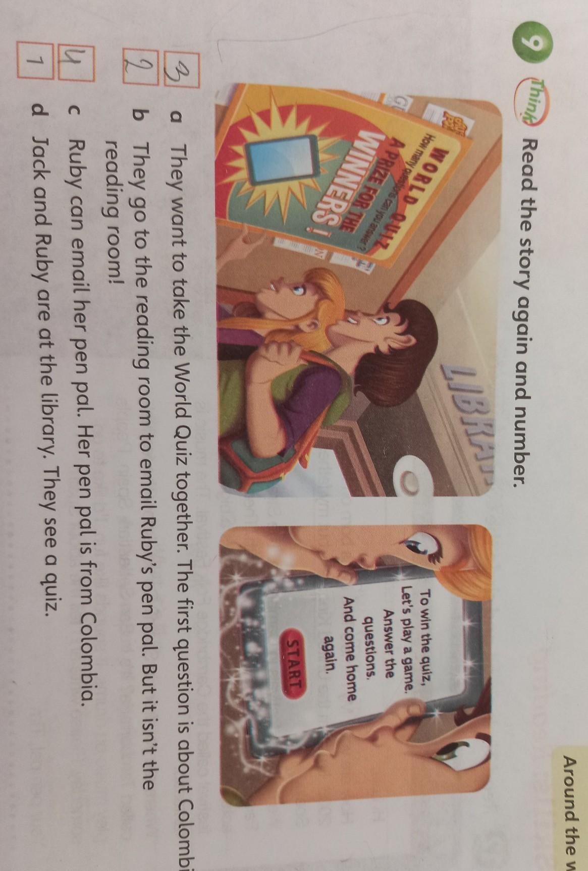 3 2 14 Think 1 Read the story again and number. LIBRATE WORLD QUIZ How many pitors can you answer A PRIZE FOR THE WINNERS! To win the quiz, Let's play a game. Answer the questions. And come home again. START a They want to take the World Quiz together. The first question is about Colom b They go to the reading room to email Ruby's pen pal. But it isn't the reading room! c Ruby can email her pen pal. Her pen pal is from Colombia. d Jack and Ruby are at the library. They see a quiz. переведите плис до 11