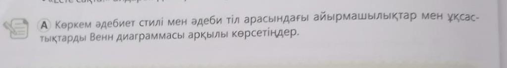 А Көркем әдебиет стилі мен әдеби тіл арасындағы айырмашылықтар мен ұксас- тықтарды Венн диаграммасы арқылы көрсетіңдер. помогите пожалуйста