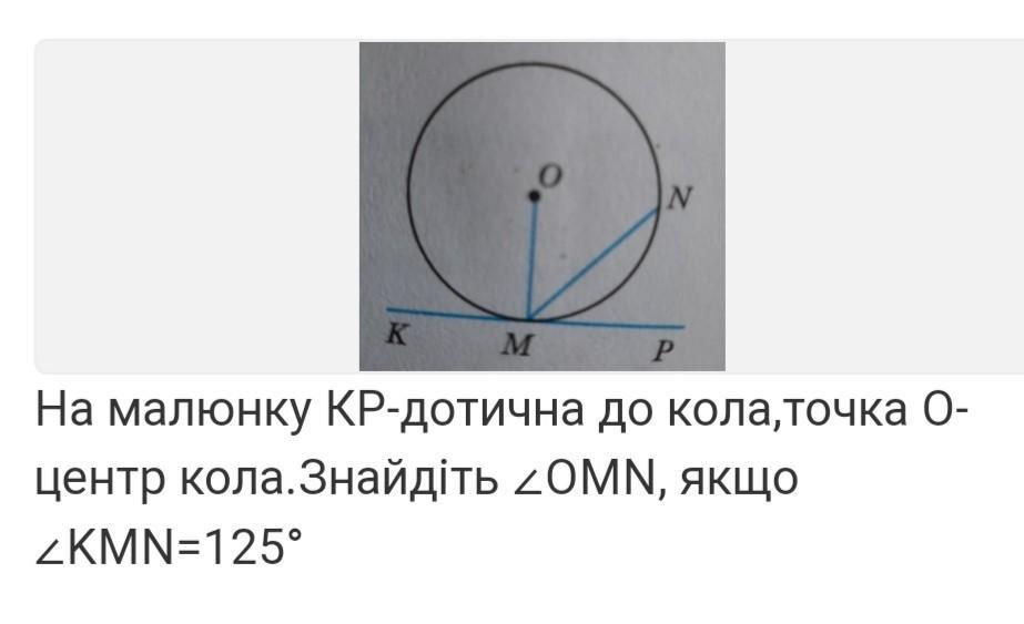 Пояснення: оскільки КР дотична то радіус ОМ проведений до точки дотику М утворює два кути по 90 (два прямі кути) отже 125-90 і це дорівнює 35