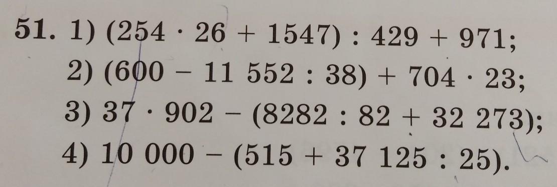 51. 1) (254-26 + 1547): 429 + 971; 2) (600 - 11 552 38) + 704 · 23; 3) 37902 - (8282 82 + 32 273); 4) 10 000 - (515 + 37 125 : 25).