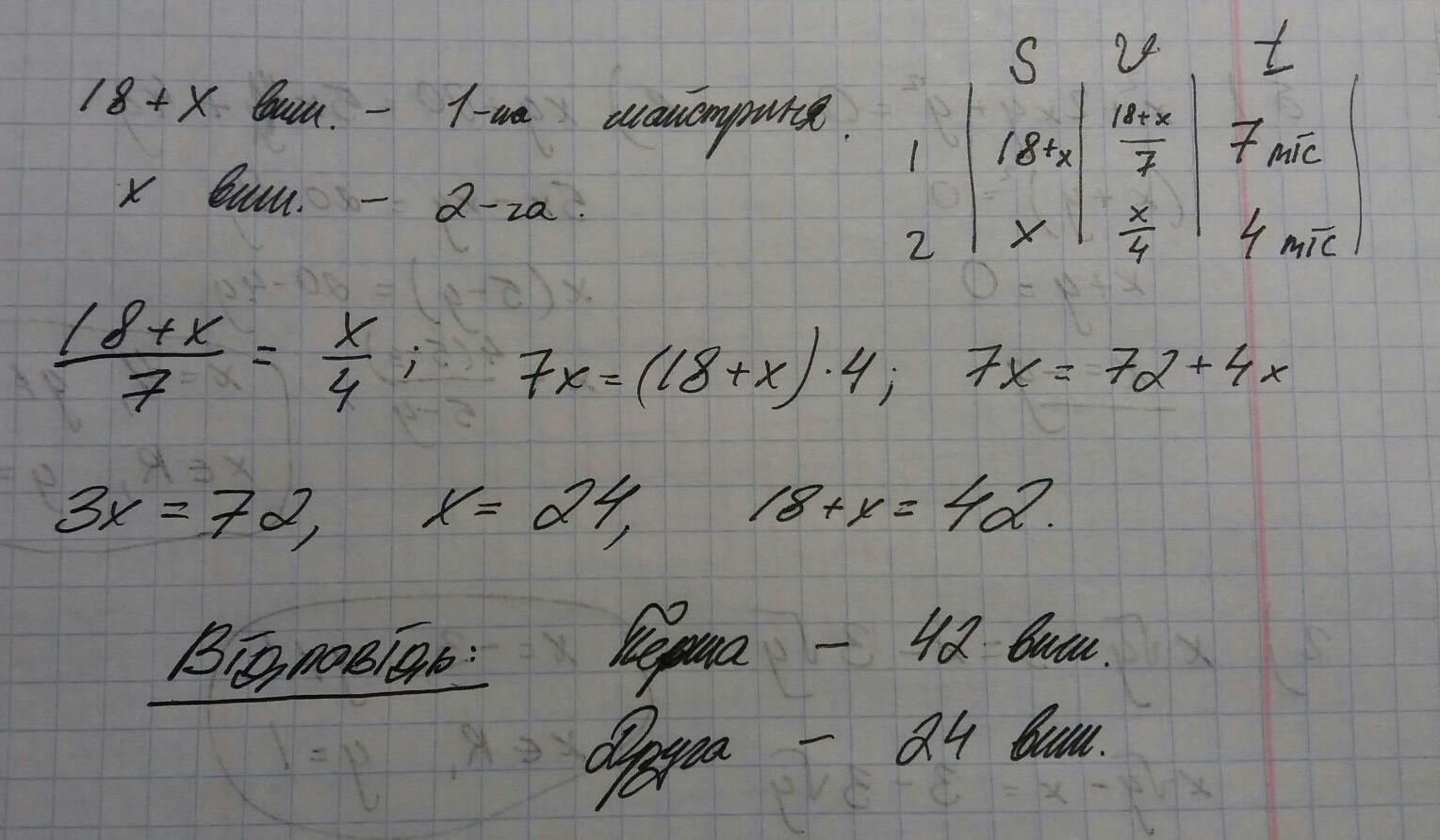 Дві майстрині працюють з однаковою продуктивністю праці.одна з них працювала 7 місяців,а інша- 4 місяці.при цьому перша майстриня виготовила на 18 вишиванок більше,ніж друга.скільки вишиванок виготовлла перша майстриня і стільки друга?