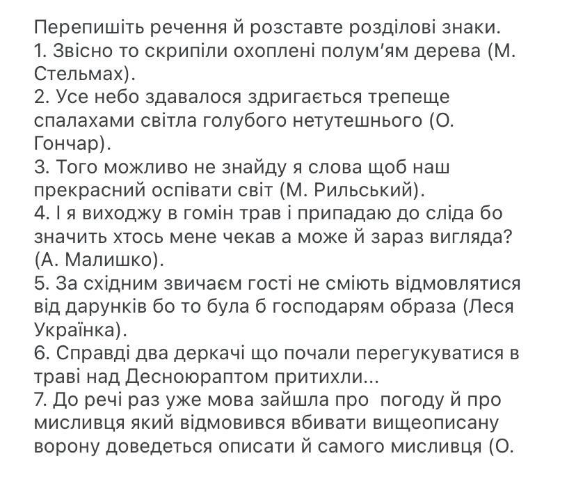 1. Звісно, то скрипіли охоплені полум'ям дерева. 2. Усе небо, здавалося, здригається, трепече спалахами світла голубого, нетутешнього. 3. Того, можливо, не знайду я слова, щоб наш прекрасний оспівати світ. 4. І я виходжу в гомін трав, припадаю до сліда, бо, значить, хтось мене чекав, а може, й зараз вигляда. 5. За східним звичаєм, гості не сміють відмовлятися від дарунків, бо то була б господарям образа. 6. Справді, два деркачі, що почали перегукуватися в траві над Десною, раптом притихли? 7. До речі, раз уже мова зайшла про погоду про мисливця, який відмовився вищеописану вбивати ворону, доведеться описати й самого мисливця.