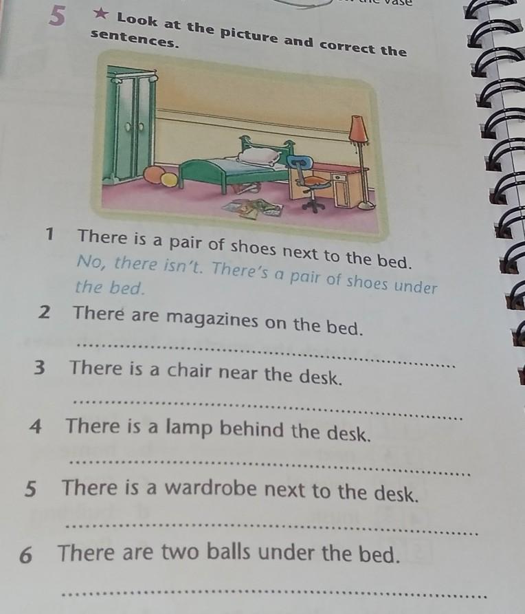 5 2 the vase Look at the picture and correct the sentences. 00 1 There is a pair of shoes next to the bed. No, there isn't. There's a pair of shoes under the bed. There are magazines on the bed. 3 There is a chair near the desk. 4 There is a lamp behind the desk. 5 There is a wardrobe next to the desk. 6 There are two balls under the bed.