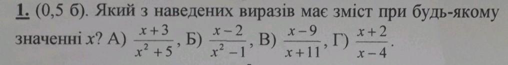 Який з наведених виразів має зміст при будь-якому значеннi х? A) Б) ——27, В) Х11, Г) x-2 x+3 x² +5' x-9 x² -1 x+11 x+2 x-4 .
