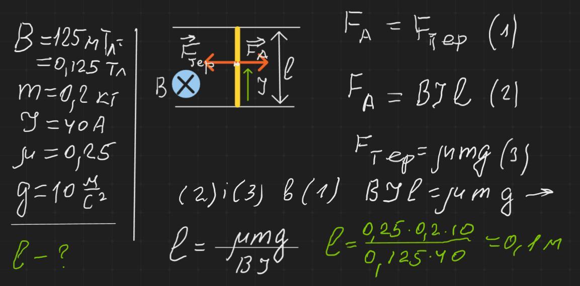 59. На горизонтальних рейках лежить перпендикулярно до них у вертикальному однорідному магнітному полі з iндукцiсю 125 метл стержень масою 0,2 кг. Стержень почав рухатись, коли по ньому пропустили струм 40 А. Яка відстань між рейками, якщо коефіцієнт тертя стержня об рейки 0,25? алп co Т an