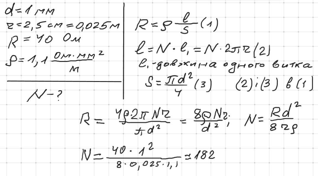 Скільки витків ніхромового дроту діаметром 1 мм треба намотати на порцеляновий циліндр радіусом 2,5 см щоб отримати резистор опором 40 Ом. Питомий опір нікрому 1,1 Ом мм²/м.