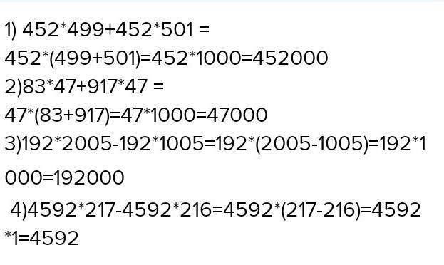 обчисли значення виразу використовуючи розподільну властивість множення!!! 1) 452*499+452*501 2)83*47+917*47 3)192*2005-192*1005 4)4592*217-4592*216