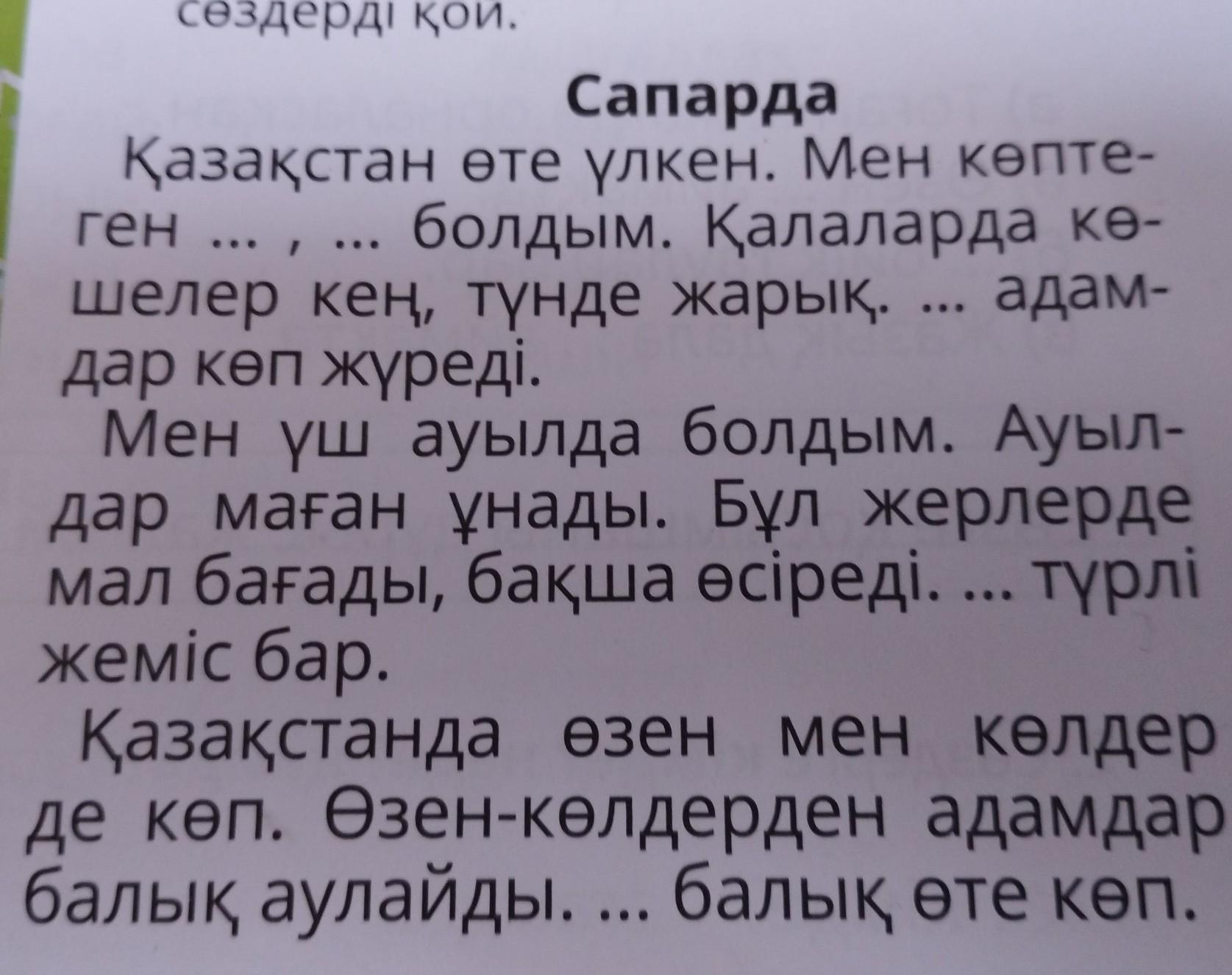 Мен үш ауылда боладым. Ауылдар маған ұнады. Бұл жерлерде мал бағады, бақша өсіреді. Бақшада түрлі жеміс бар.