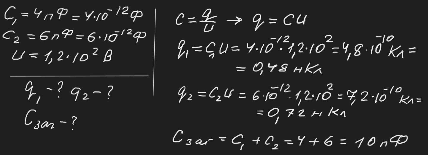 Два конденсатори з' єднанні паралельно C1= 4 пФ ,С2 = 6 пФ ,напруга U=120B Визначити заряди на конденсаторах q1,q2, загальну ємність С?