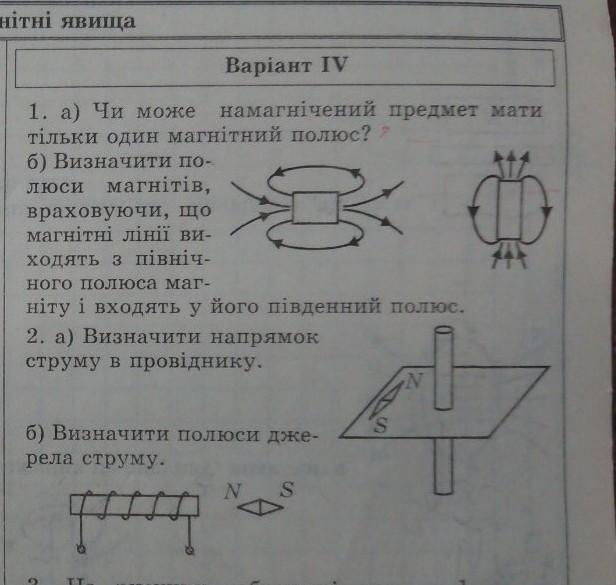 1. a) Чи може намагнічений предмет мати тiльки один магнітний полюс? б) Визначити по- люси магнітів, враховуючи, що магнітні лінії ви- ходять з північ- ного полюса маг- ніту і входять у його південний полюс. 2. а) Визначити напрямок струму в провіднику. б) Визначити полюси дже- рела струму.