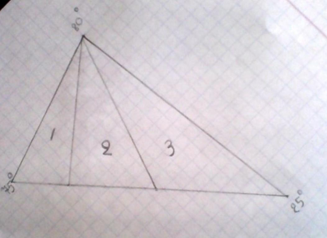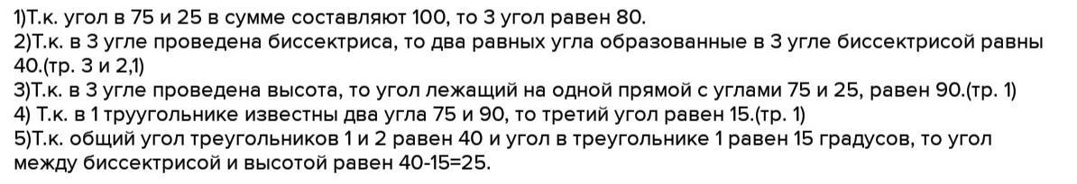 6. Виконай одне із завдань на вибір. (3 бали) а) Два кути трикутника дорівнюють відповідно 75° та 25°. Знайди кут між ви- - сотою та бісектрисою, що проведені з третьої вершини трикутника. ● 6)