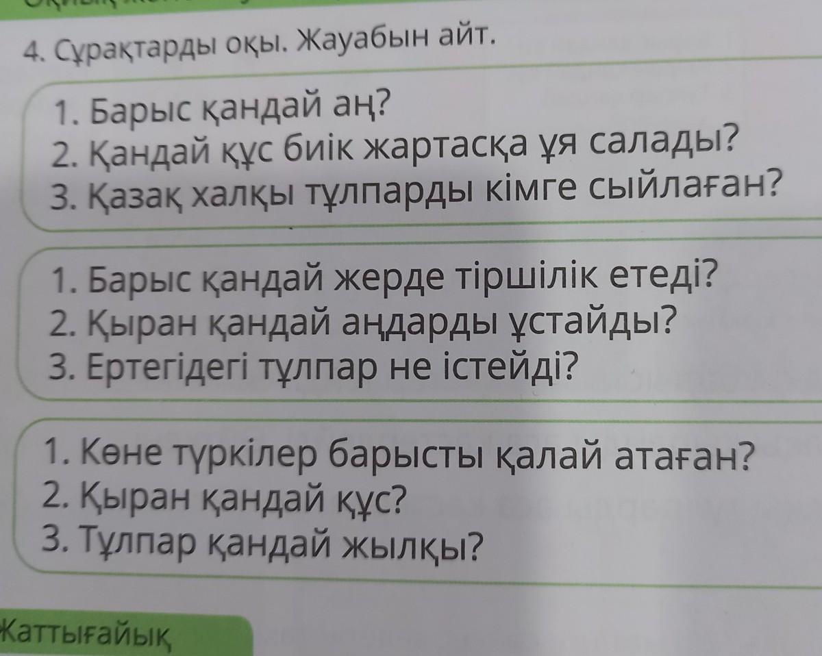 Ответ:1)Барыс - биік тауда мекендейтін ерекше сымбатты жыртқыш аң. Ол өте айлакер, күшті әрі шапшаң