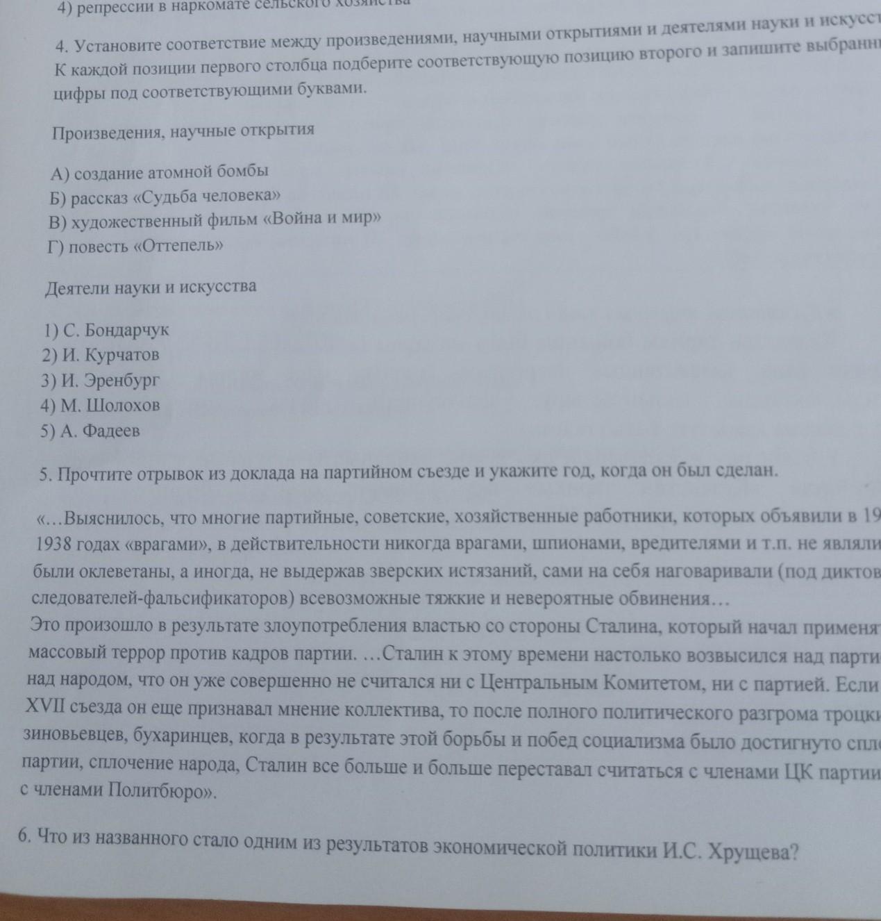 4. Установите соответствие между произведениями, научными открытиями и деятелями науки К каждой позиции первого столбца подберите соответствующую позицию второго и запишите цифры под соответствующими буквами. Произведения, научные открытия А) создание атомной бомбы Б) рассказ > В) художественный фильм «Война и мир» Г) повесть
