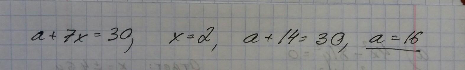 Знайди таке значення a, що коренем рівняння a+x•7=30 було число 2 помогите