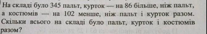 Курток було на 86 штук більше, якщо "на", то треба додати. 345+86=431 шт курток. Потім треба додати куртки до пальт, тобто 431+345=776. Костюмів на 102 менше, віднімаємо 776-102=674. Потім усе додаємо - 776+674=1450