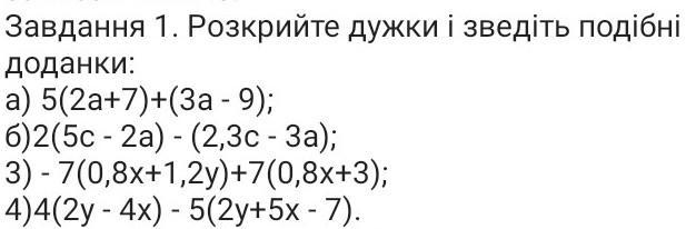 г) 4(2у - 4х) - 5(2у + 5х - 7) = 8у - 16х - 10у - 15х + 35 = 35 - 2у - 31х