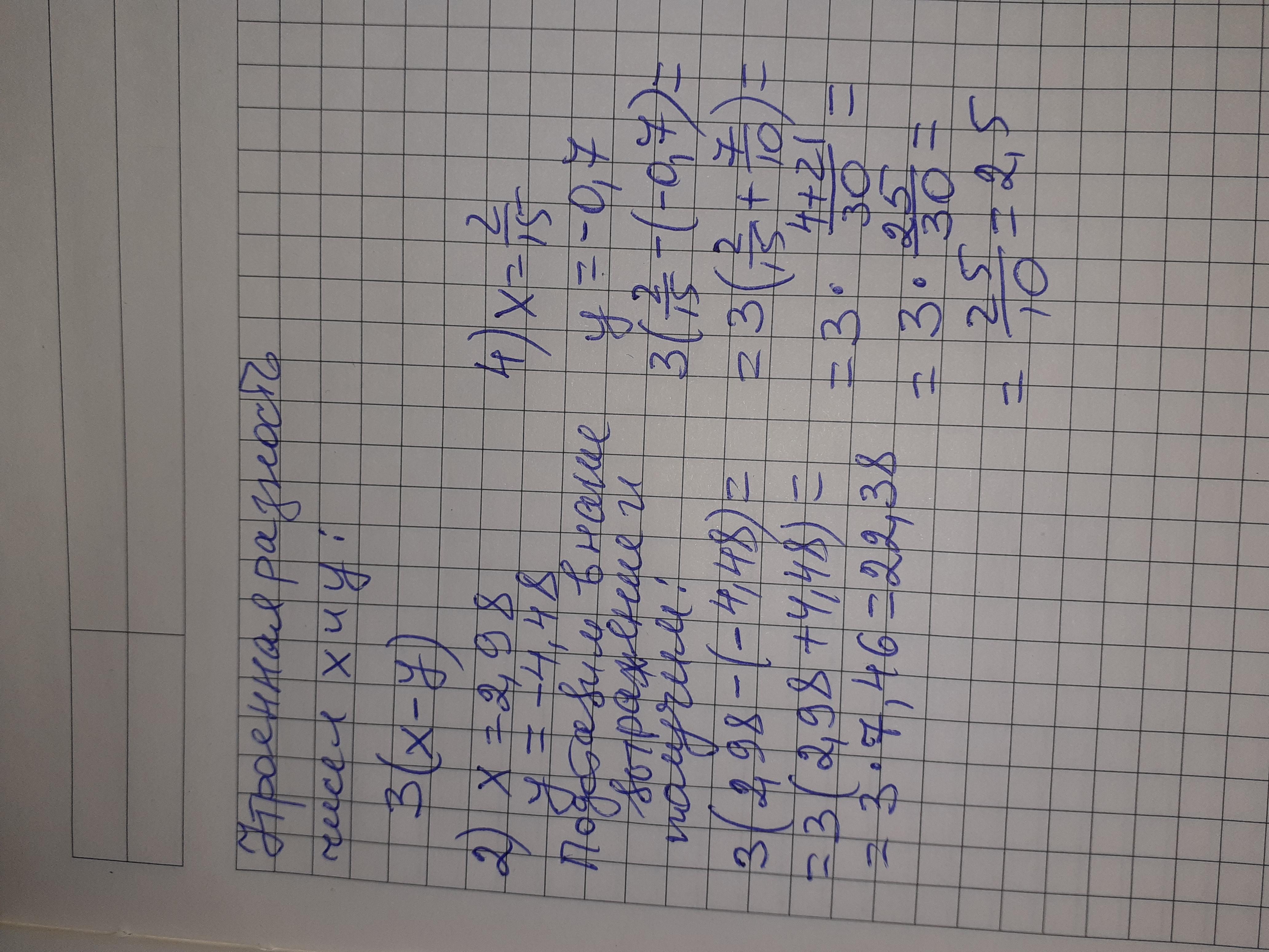 Запишите утроенную разность чисел х и у. Найди числовое значение этого выражения при: 2) x=2,98, y=-4,48, 4)0x=2/15,y=-0,7