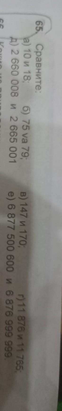 65. Сравните: а) 10 и 18; б) 75 va 79; A) 2 660 008 и 2 665 001 66. Какие из приведенных B) 147 и 170; r) 11 876 и 11 765; e) 6 877 500 600 и 6 876 999 999.Сравните а 10 и 18