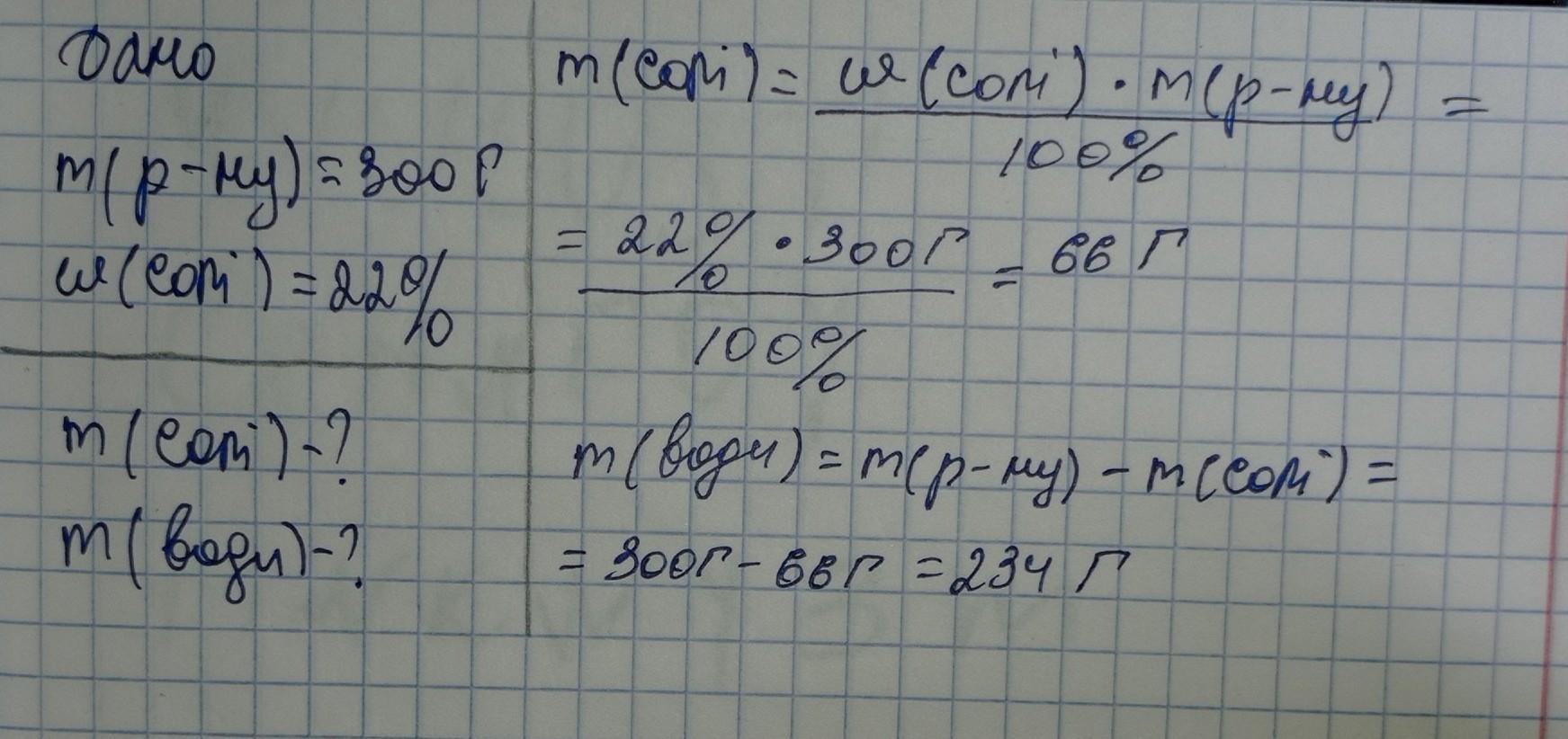 обчисліть, яку масу солі і яку масу води необхідно взяти, щоб одержати розчин масою 300 г з масовою часткою солі 22% ?