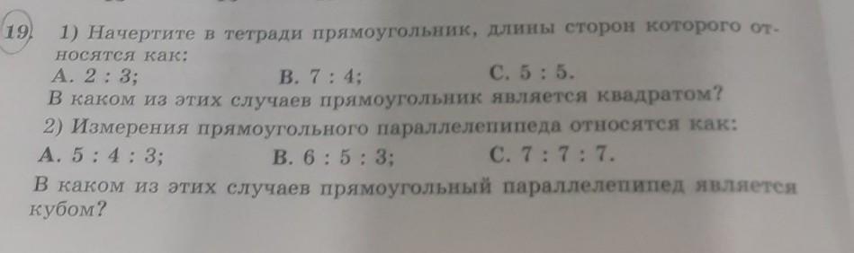1) Начертите в тетради прямоугольник, длины сторон которого от с. 5 : 5. A. 2 : 3; B. 7 : 4; В каком из этих случаев прямоугольник является квадратом? еда отн