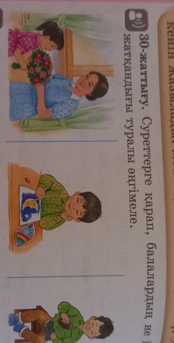 30-жаттығу. Суреттерге қарап, балалардың не істеп жаткандығы туралы әңгімеле. 31-жаттығу. Сөйлемдерді толықтырып жаз. Анама ба