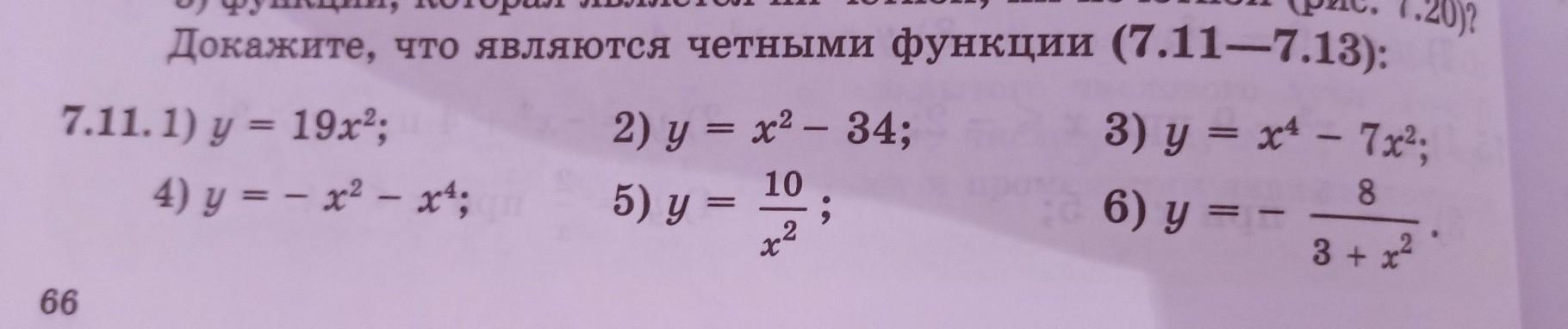 Докажите, что являются четными функции (7.11-7.13): 7.11.1) у = 19x2; = 4) y = - x2 - x4; 2) y = x² - 34; 10 5) y = х? 3) y = x4 - 7x2; 8 3 + x² 6) y = 1.20)? Помогите пожалуйста !
