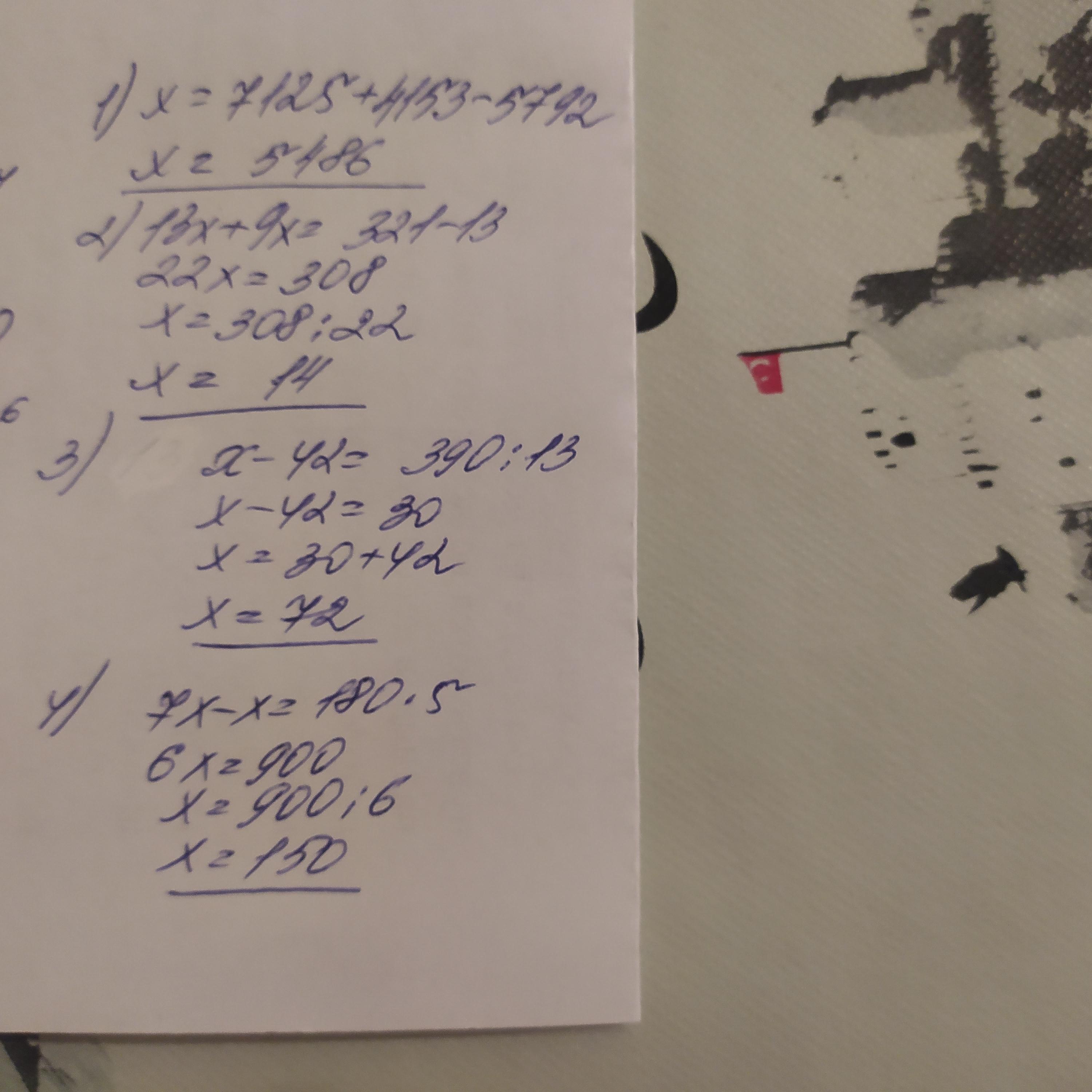 24. Розв'яжи рiвняння: 1) (x + 5792) - 4153 = 7125; 2) 13х + 9х + 13 = 321; 3) (х- 42)*13 = 390; 4) (7х - х) : 5= 180 очень срочно