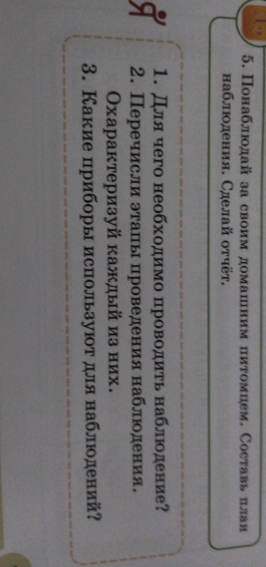 5. Понаблюдай за своим домашним питомцем. Составь план наблюдения. Сделай отчёт. 1. Для чего необходимо проводить наблюдение, 2. Перечисли этапы проведения наблюдения. Охарактеризуй каждый из них. 3. Какие приборы используют для наблюдений?