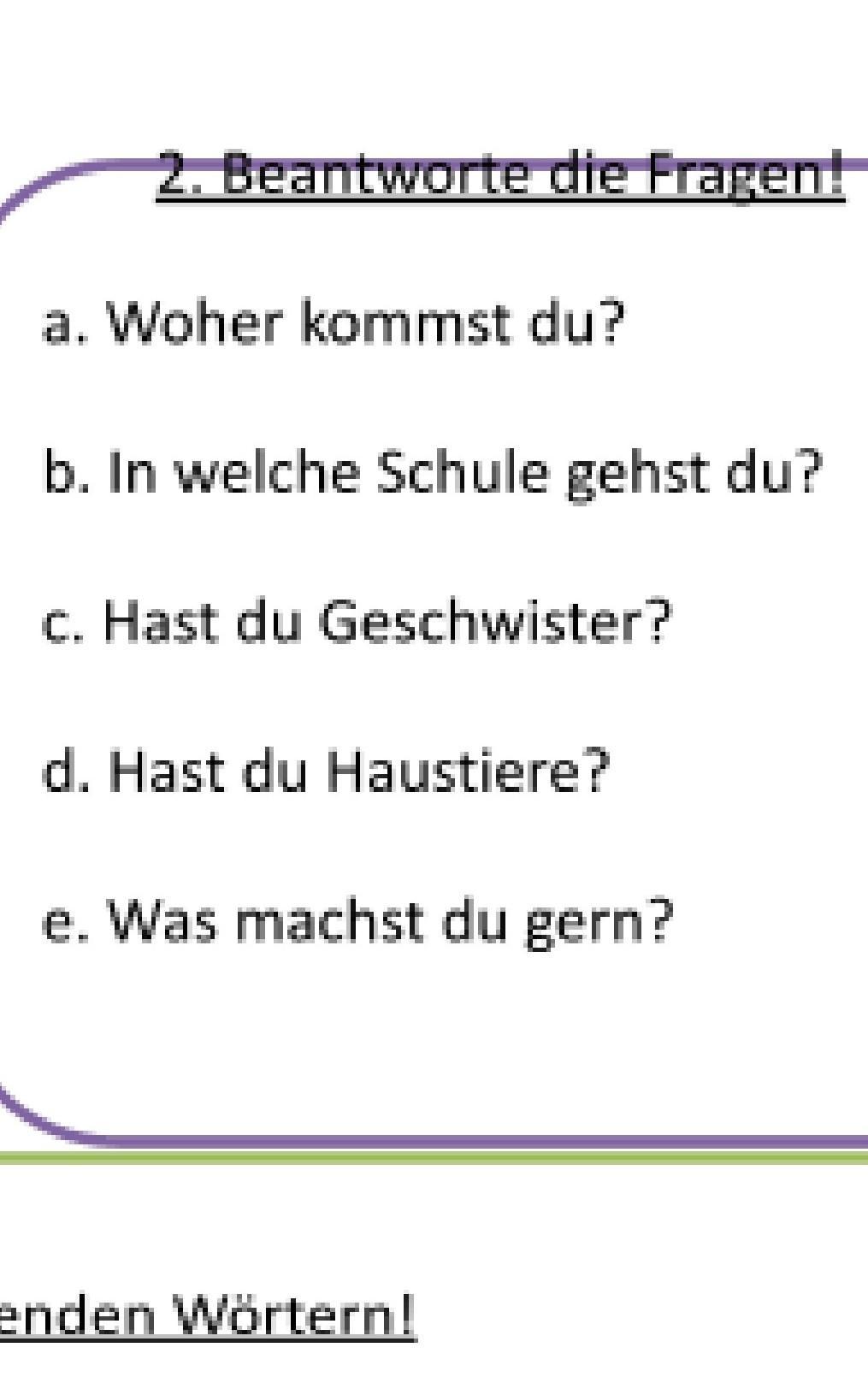 2. Beantworte die Fragen! a. Woher kommst du? b. In welche Schule gehst du? c. Hast du Geschwister? d. Hast du Haustiere? e. Was machst du gern? переклад, перевод