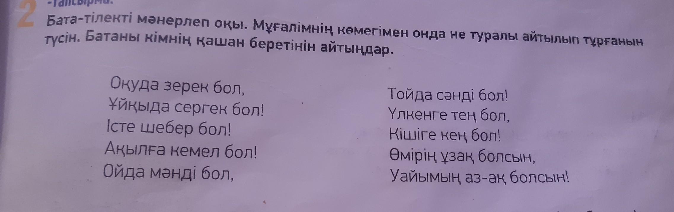 бұл батада оқуға,мектепке енді баратын балаға айтылған.Мұнда сабақты жақсы оқып,үлкенге құрмет кішіге ізет көрсетіп ұзақ жасауын айтқан.