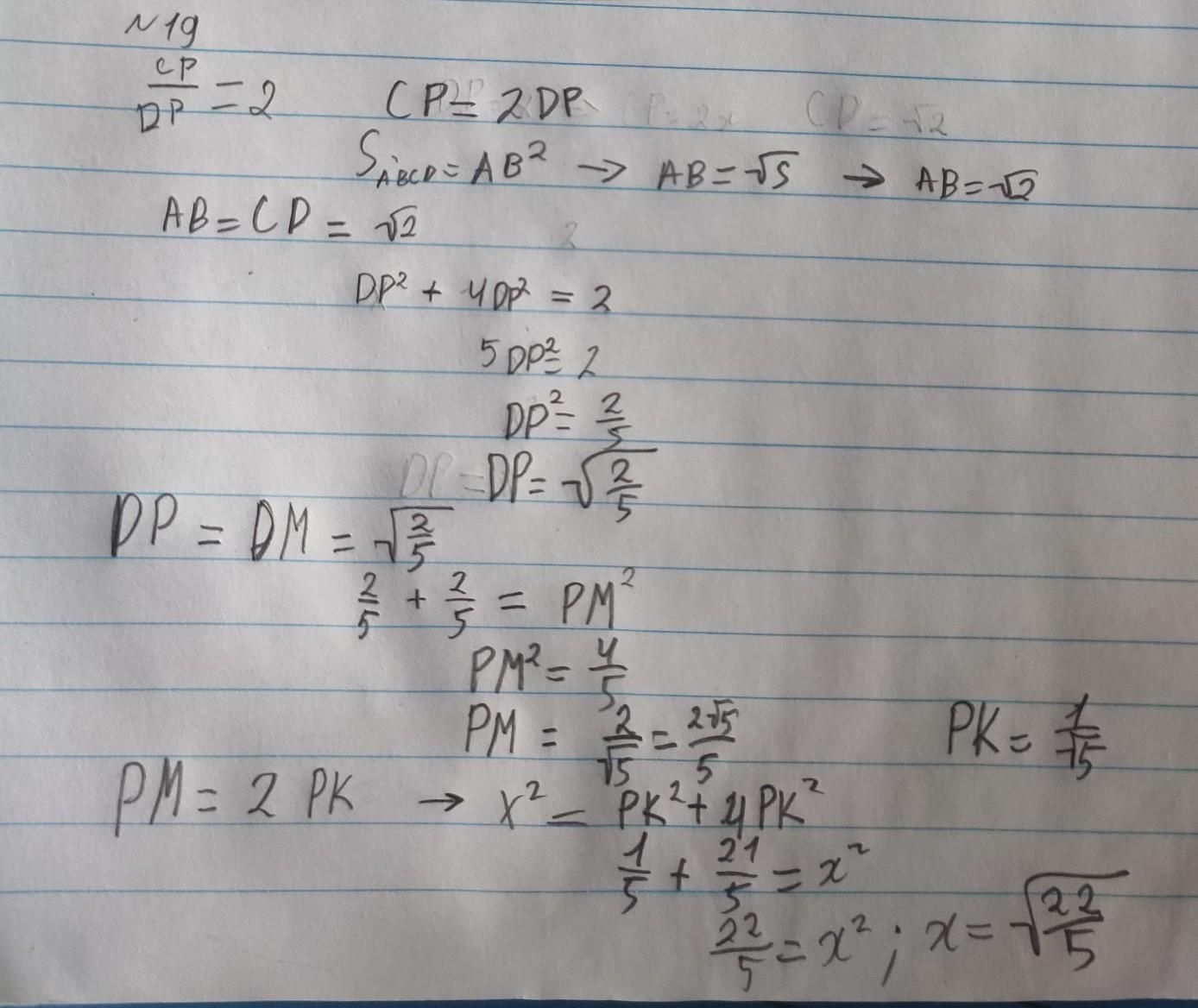 Спасибо большое за решение. Оно мне очень помогло. Только хочу сказать,ч то ответ здесь 1. Ты просто не совсем правильно посчитал сторону PK( надо ✓5/5). А так решение правильное. В общем, ещё раз спасибо, а то я около часа изучалась с этой задачей