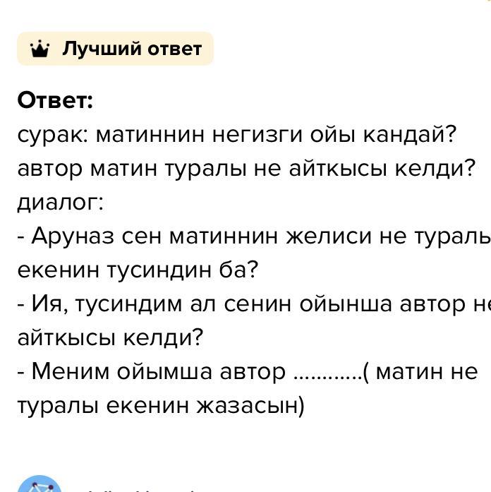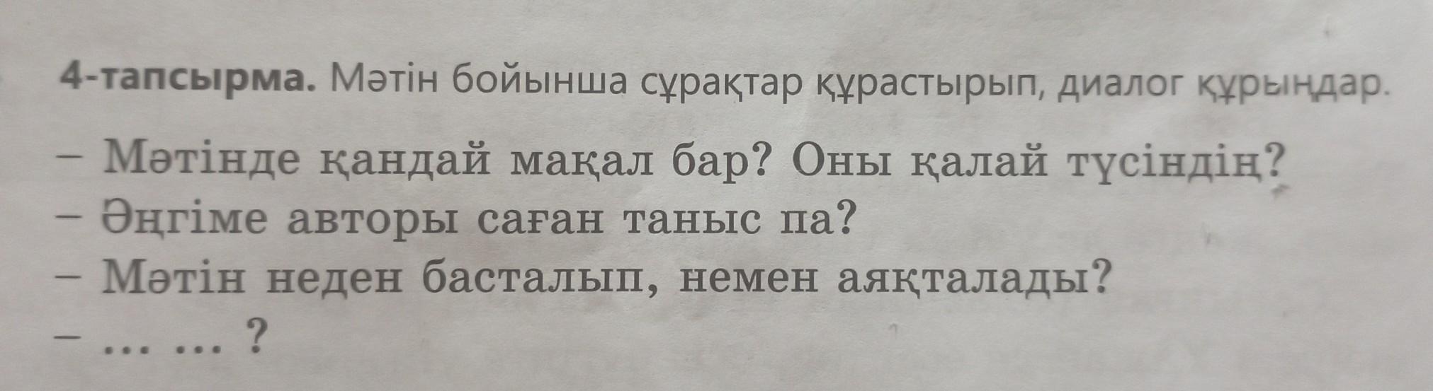 4-тапсырма. Мәтін бойынша сұрақтар құрастырып, диалог құрыңдар. Мәтiнде кандай макал бар? Оны қалай түсiндiн? Әңгіме авторы саган таныс па? Мәтін неден басталып, немен аяқталады? - ... ?