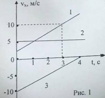 за графіком залежності проекції швидкості від часу (рис.1) вказати для кожного тіла початкову швидкість, напрям руху, характер(вид) руху і обчислити прискорення.