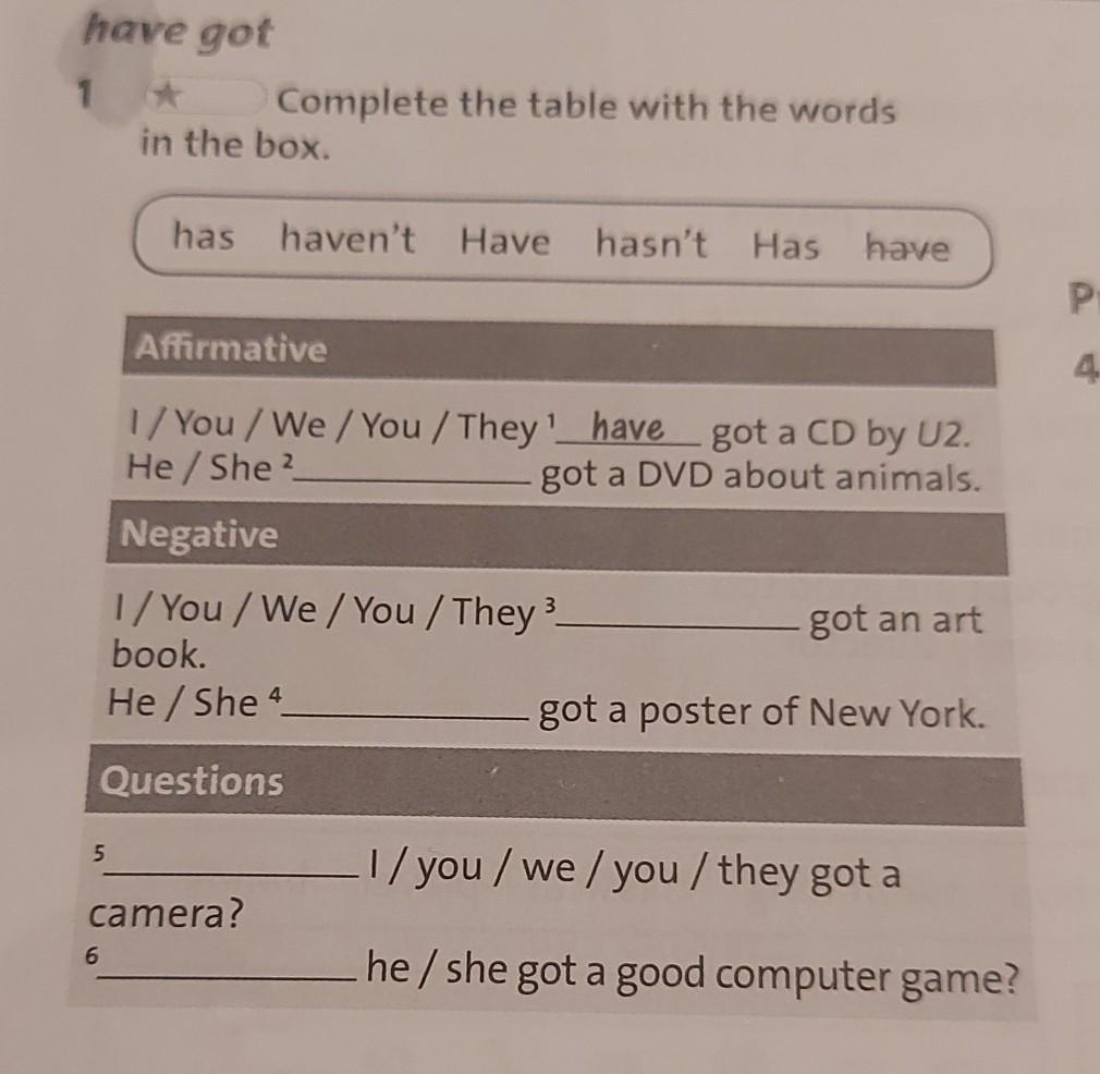 have got 1 Complete the table with the words in the box. 5 has haven't Have hasn't Has have Affirmative 1/You/We/You / They have got a CD by U2. He/She ¹. got a DVD about animals. Negative 1/You/We/You / They'. book. He/She 4. Questions camera? got an art got a poster of New York. 1/you/we/you/ they got a he/she got a good computer game?