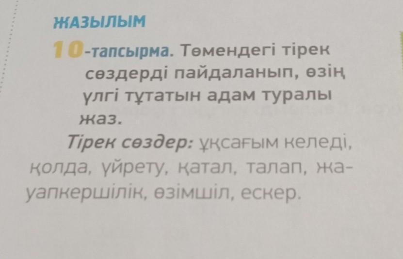 ЖАЗЫЛЫМ 10-тапсырма. Төмендегi тiрек сездерді пайдаланып, езiң үлгі тұтатын адам туралы жаз. Тiрек сөздер: уксағым келеді. колда, уйрету, катал, талап, жа уапкершiлiк, езiмшiл, ескер